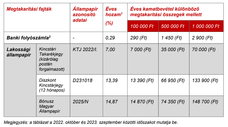 Az alábbi táblázat azt mutatja be, hogy egy éves időszakra számítva mekkora többlet kamatbevételt érhetett volna el, ha megtakarításait folyószámla helyett különböző állampapírokban tartja."